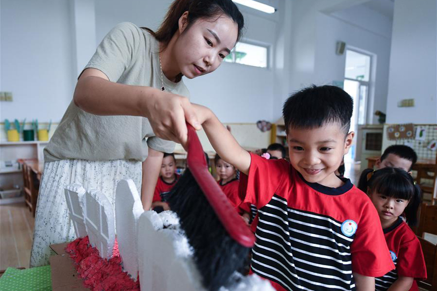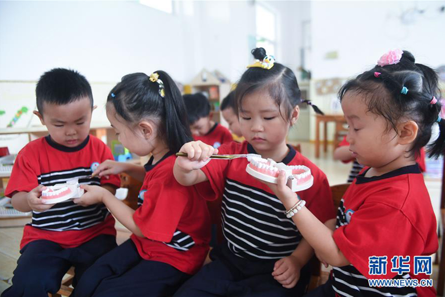 1/09月16日,孩子在學(xué)習(xí)正確的刷牙方式。在9月20日全國愛牙日來臨前,為了讓孩子們學(xué)習(xí)正確的刷牙方法,從小培養(yǎng)愛護(hù)牙齒的好習(xí)慣,浙江省湖州市長興縣夾浦鎮(zhèn)中心幼兒園開展了“護(hù)牙大作戰(zhàn)”的愛牙日系列主題活動,通過模型、圖片、互動練習(xí)、游戲等多種方式讓孩子們了解牙齒的構(gòu)造,學(xué)習(xí)正確的刷牙方式。(新華社記者 徐昱/攝)