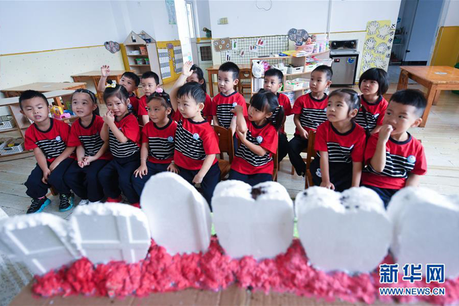 1/09月16日,孩子們在學(xué)習(xí)正確的刷牙方式。(新華社記者 徐昱/攝)