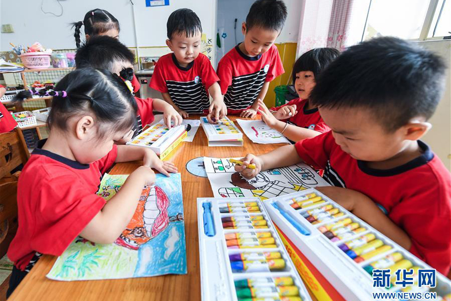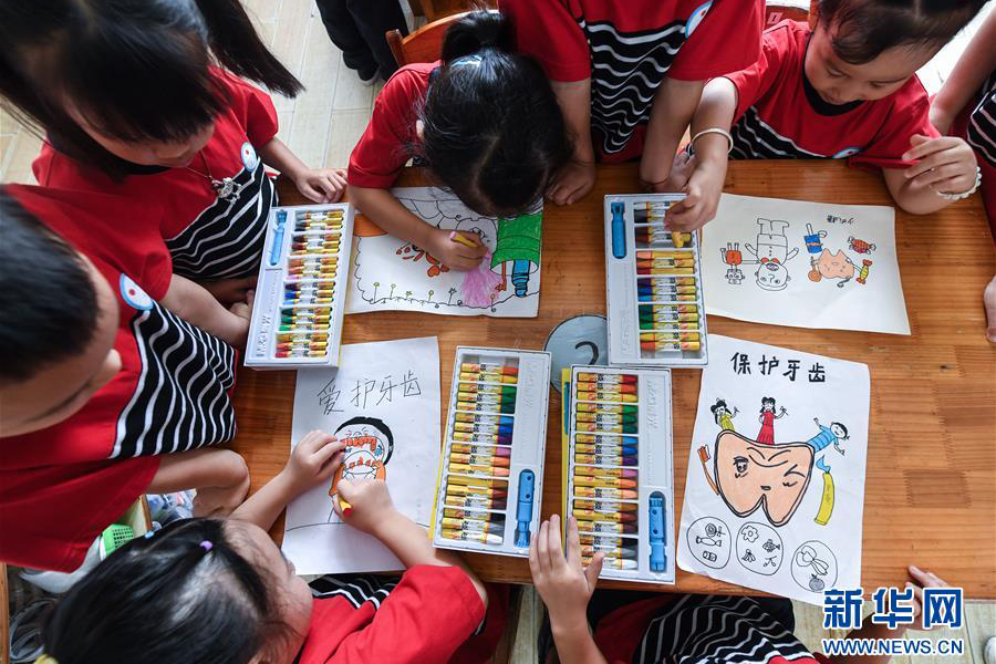 1/09月16日,孩子們在畫愛牙日主題宣傳畫。(新華社記者 徐昱/攝)