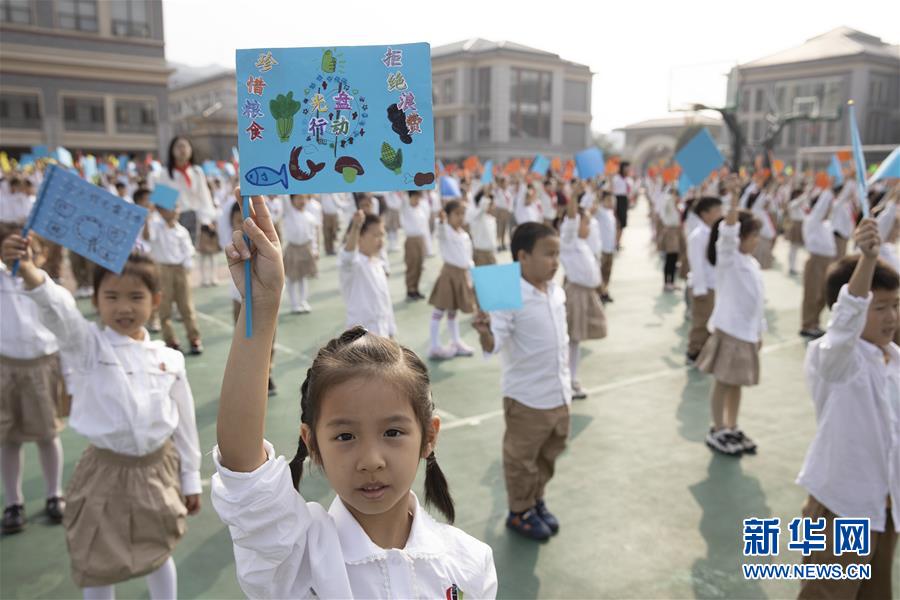 1/010月13日,浙江省諸暨市店口鎮(zhèn)弘毅小學(xué)的學(xué)生高舉自制宣傳小旗進(jìn)行節(jié)糧宣誓。(新華社發(fā) 郭斌/攝)