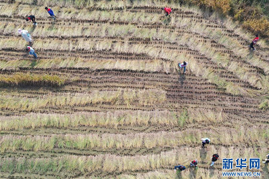 1/010月13日,在湖南省衡陽(yáng)市衡陽(yáng)縣庫(kù)宗橋鎮(zhèn)華山村,庫(kù)宗橋鎮(zhèn)玩市完全小學(xué)的同學(xué)們?cè)谑崭詈蟮牡咎锢飺斓舅?(無(wú)人機(jī)拍攝)。(新華社發(fā) 曹正平/攝)