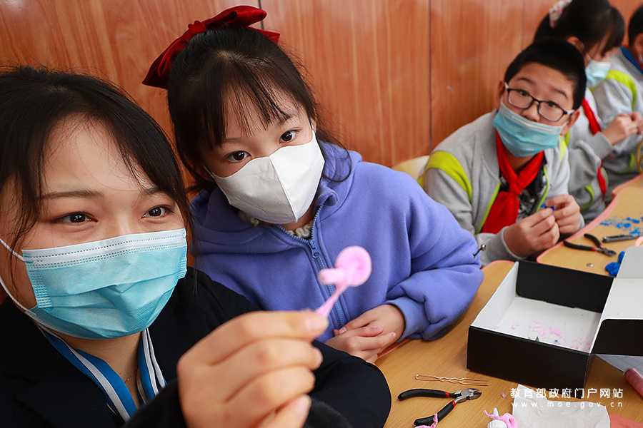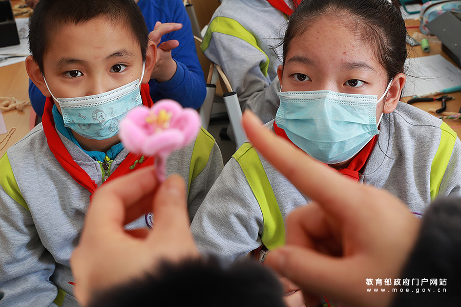 課堂上,老師正在指導(dǎo)學(xué)生制作絨花發(fā)簪。(朱厚穎、張學(xué)軍/攝)