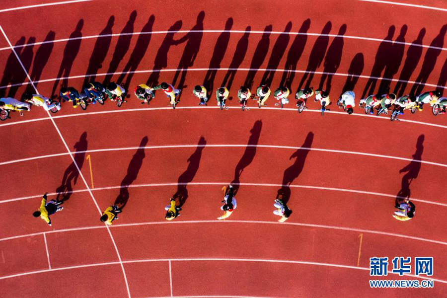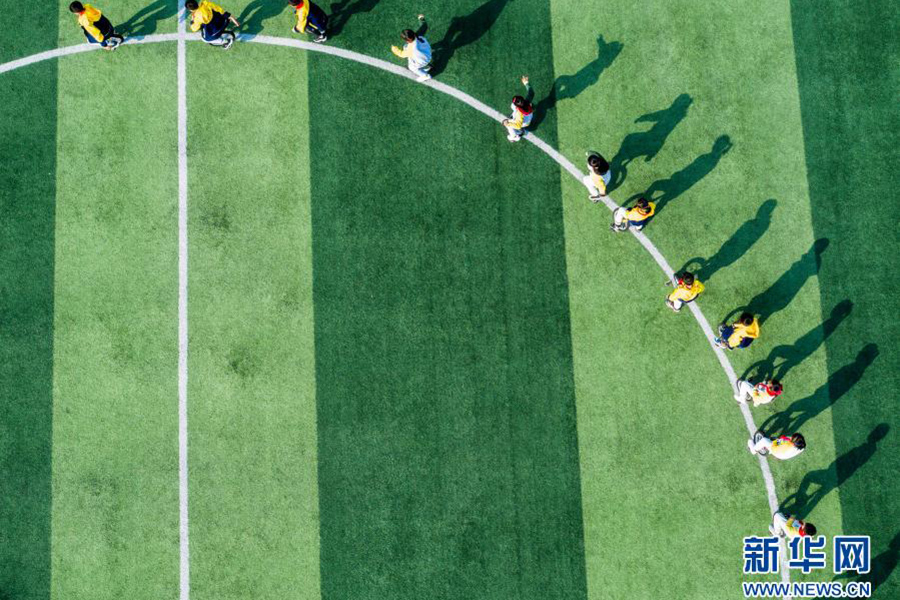 1/011月13日,在泗洪育才實驗學校,學生在騎行獨輪車(無人機照片)。(新華社發(fā) 許昌亮/攝)