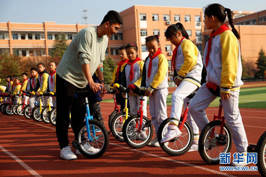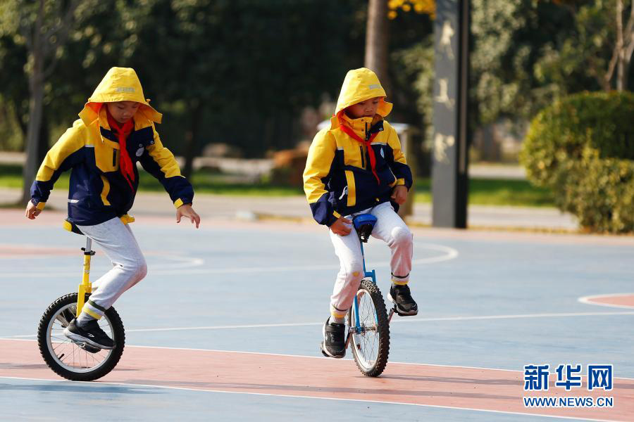 1/011月13日,在泗洪育才實驗學校,學生在騎行獨輪車。(新華社發(fā) 許昌亮/攝)