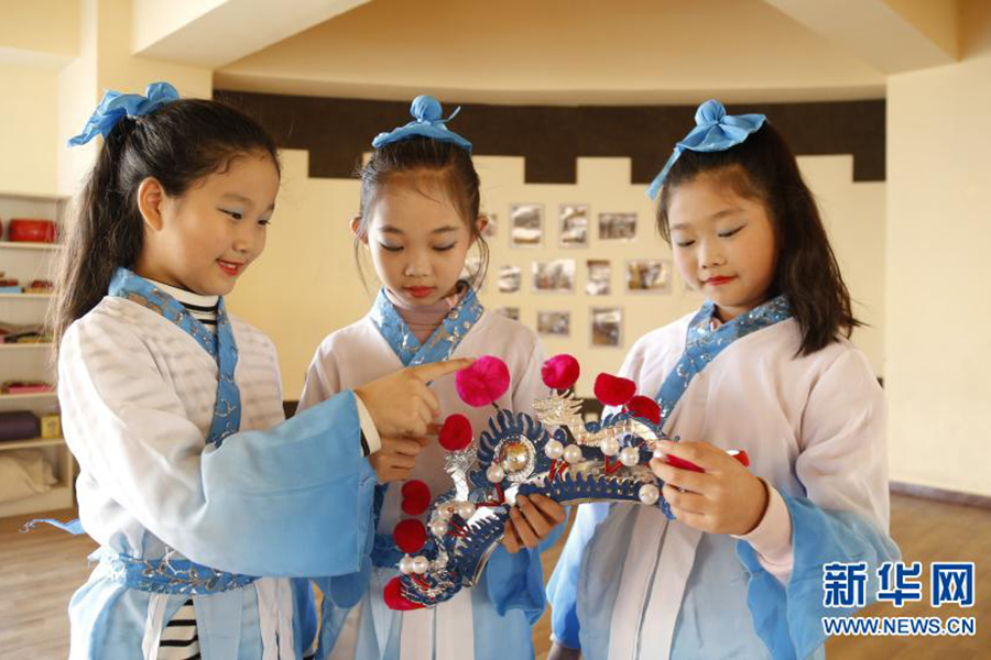 1/011月19日,在河北省邢臺(tái)市家樂(lè)園小學(xué),孩子們?cè)诹私鈶蚯^飾。(新華社發(fā) 張馳/攝)