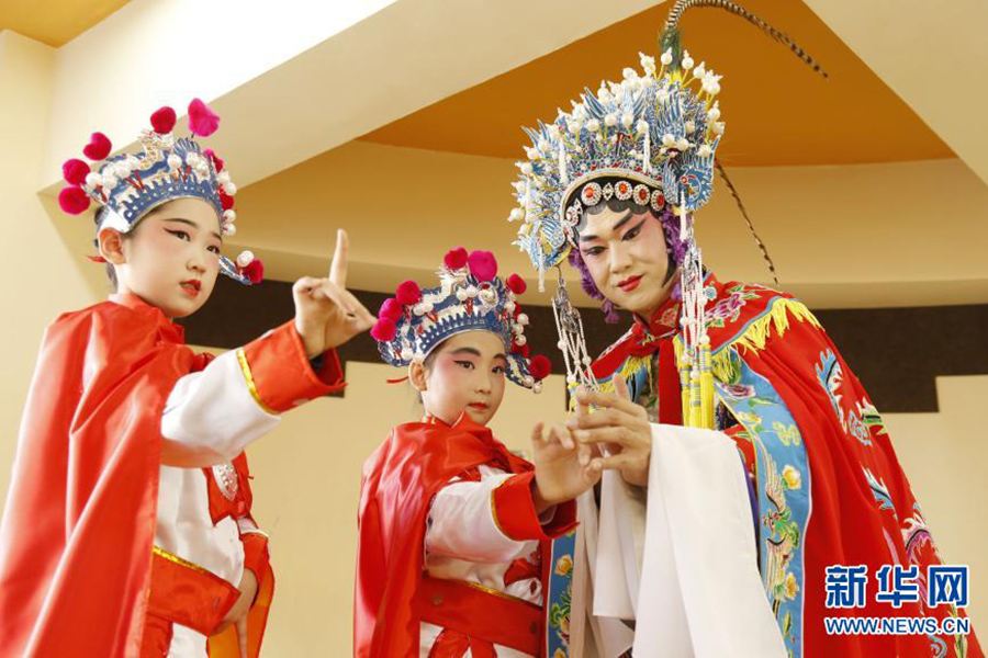 1/011月19日,在河北省邢臺(tái)市家樂(lè)園小學(xué),戲曲教師指導(dǎo)孩子們練習(xí)戲曲。(新華社發(fā) 張馳/攝)