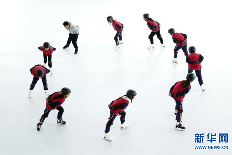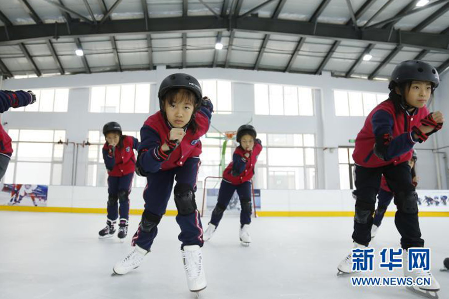 1/011月24日,邢臺市一所小學(xué)的學(xué)生在練習(xí)冰上速滑。(新華社發(fā) 張馳/攝)