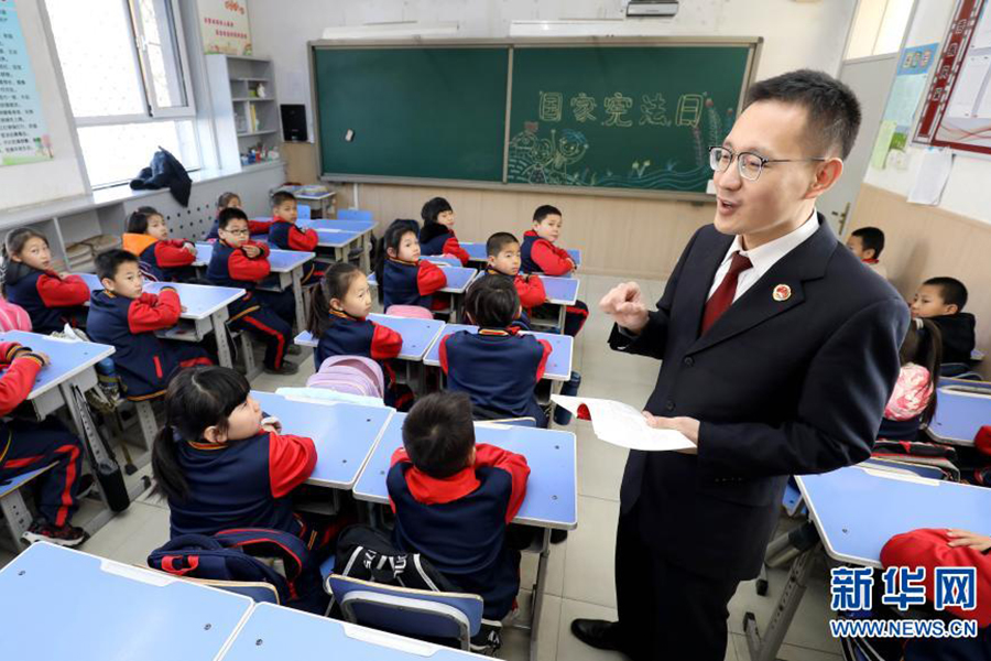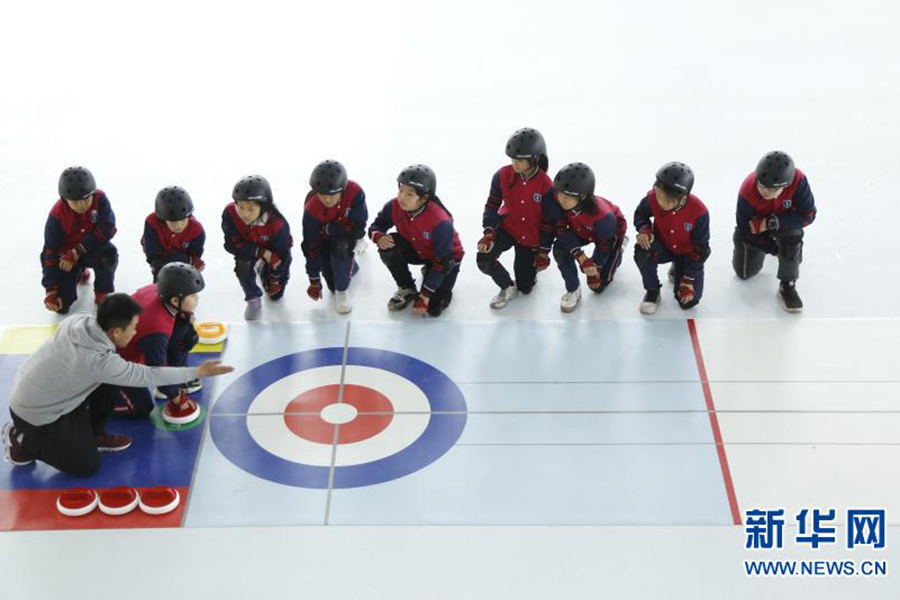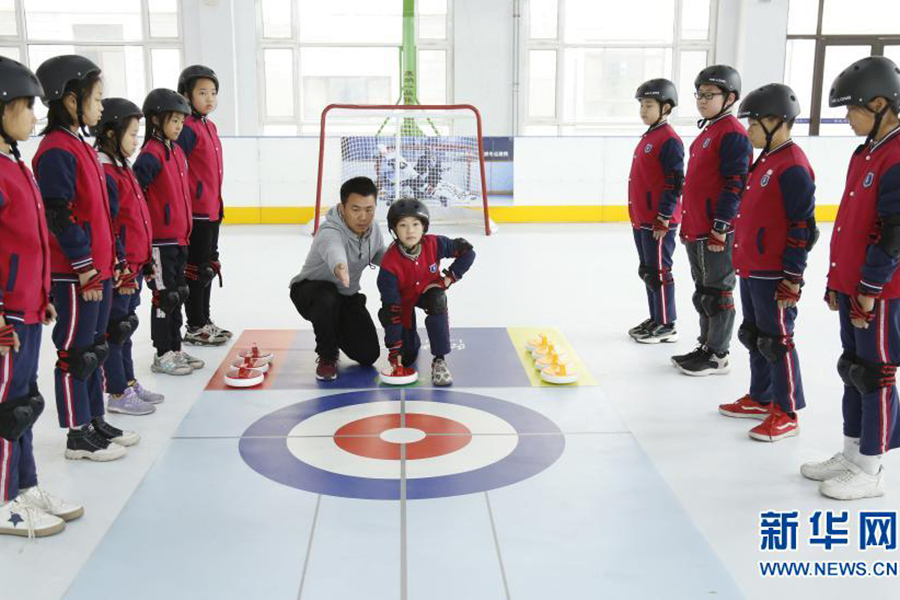 1/011月24日,邢臺市一所小學(xué)的老師在指導(dǎo)學(xué)生學(xué)習(xí)陸地冰壺。(新華社發(fā) 張馳/攝)