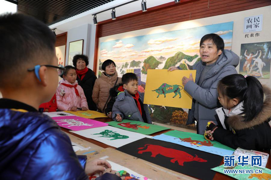 1/02021年1月4日,在浙江省諸暨市陶朱街道三都農(nóng)民畫(huà)館,三都小學(xué)美術(shù)社團(tuán)的學(xué)生展示自己學(xué)畫(huà)的生肖牛。當(dāng)日,諸暨市陶朱街道三都小學(xué)美術(shù)社團(tuán)的學(xué)生來(lái)到三都農(nóng)民畫(huà)館,在當(dāng)?shù)剞r(nóng)民畫(huà)家的指導(dǎo)下參觀農(nóng)民畫(huà)展,了解農(nóng)民畫(huà)的特點(diǎn),并學(xué)習(xí)用農(nóng)民畫(huà)的技法畫(huà)生肖牛。(新華社發(fā) 郭斌/攝)