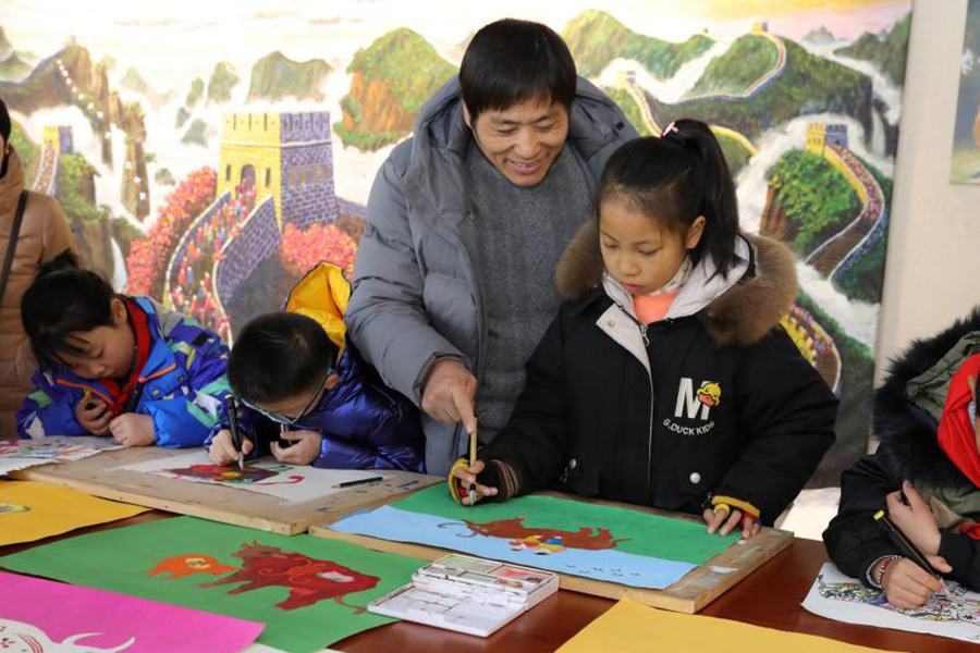 1/02021年1月4日,在浙江省諸暨市陶朱街道三都農(nóng)民畫(huà)館,農(nóng)民畫(huà)家指導(dǎo)三都小學(xué)美術(shù)社團(tuán)學(xué)生畫(huà)農(nóng)民畫(huà)。(新華社發(fā) 郭斌/攝)