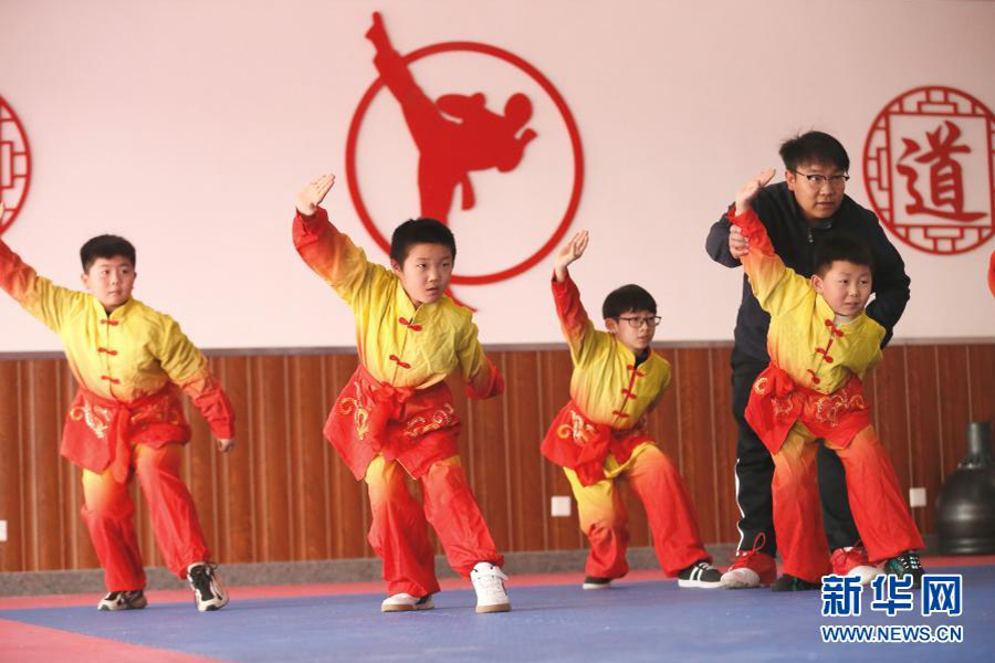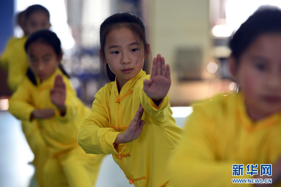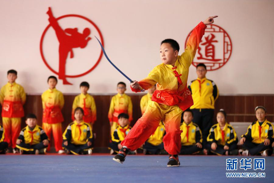 1/01月5日,山東省青島市通濟實驗學(xué)校的學(xué)生在武術(shù)課上練習(xí)。(新華社發(fā) 梁孝鵬/攝)