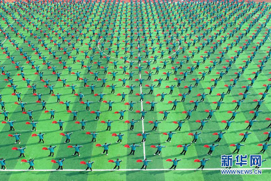 1/01月5日,山東省青島市通濟實驗學(xué)校的學(xué)生在大課間打太極扇(無人機照片)。(新華社發(fā) 梁孝鵬/攝)