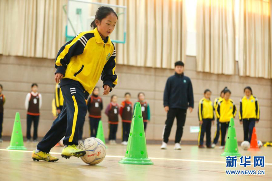 1/01月5日,山東省青島市通濟實驗學(xué)校足球社團的學(xué)生在老師的指導(dǎo)下練習(xí)運球。(新華社發(fā) 梁孝鵬/攝)