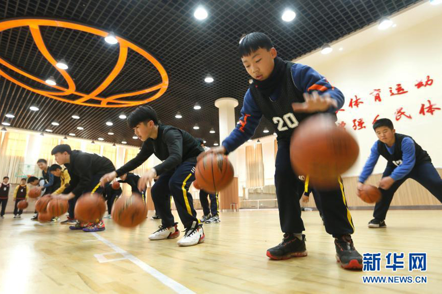 1/01月5日,山東省青島市通濟實驗學(xué)?;@球社團的學(xué)生在學(xué)習(xí)籃球技能。(新華社發(fā) 梁孝鵬/攝)