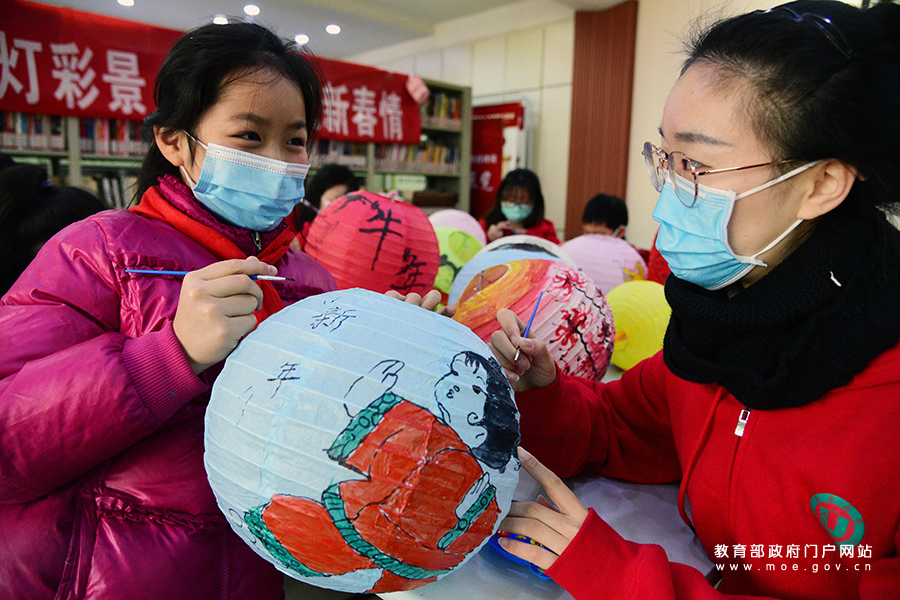 1月24日,鎮(zhèn)江市廣東山莊社區(qū),江蘇大學志愿者在指導小朋友繪制年俗主題燈籠。(石玉成/攝)