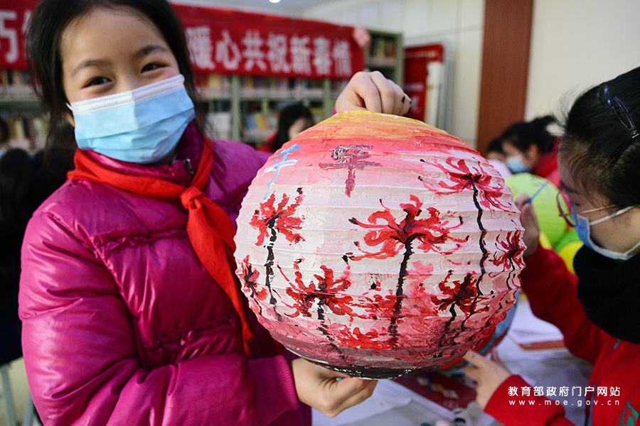 1月24日,一名小朋友在展示親手繪制的年俗主題燈籠。(石玉成/攝)