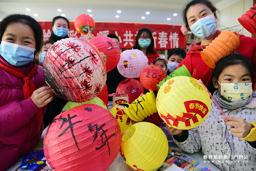 1月24日,鎮(zhèn)江市廣東山莊社區(qū),江蘇大學志愿者和小朋友共同展示繪制的年俗主題燈籠。(石玉成/攝)