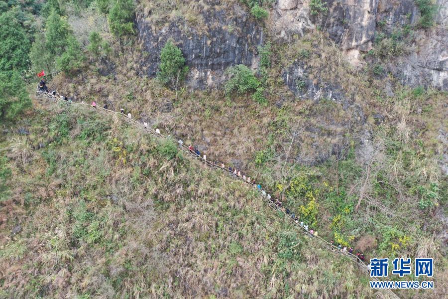 1/02月28日,學(xué)生們參加重走長征路活動(無人機(jī)照片)。(新華社記者 劉續(xù)/攝)