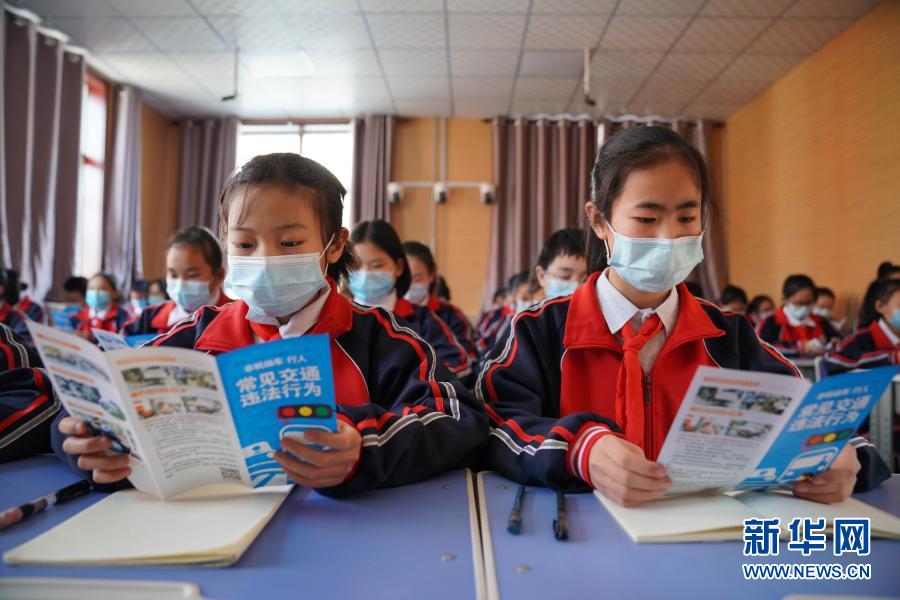 1/03月3日,河北省沙河市第四中學(xué)學(xué)生在閱讀交通安全知識(shí)手冊(cè)。(新華社記者 牟宇/攝)