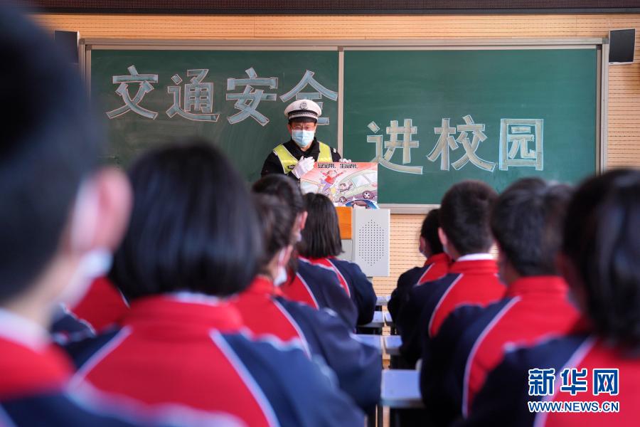 1/03月3日,河北省沙河市交警大隊(duì)民警在沙河市第四中學(xué)為學(xué)生講解交通安全知識(shí)。新學(xué)期伊始,河北省沙河市交警大隊(duì)聯(lián)合轄區(qū)內(nèi)多所中小學(xué)開展“文明交通宣傳進(jìn)校園”活動(dòng)。交警們通過現(xiàn)場(chǎng)講解、展板展示、發(fā)放讀物等方式,為學(xué)生普及交通安全知識(shí),培養(yǎng)學(xué)生的文明交通意識(shí)。(新華社記者 牟宇/攝)