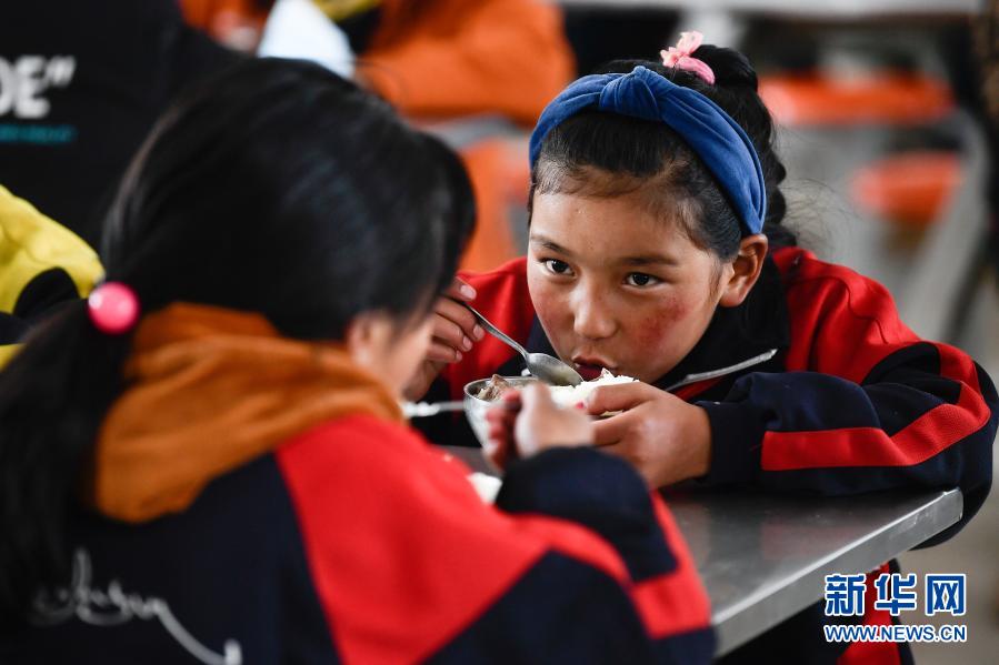 1/03月17日,在果洛藏族自治州甘德縣崗龍鄉(xiāng)寄宿制中心小學(xué),學(xué)生在食堂吃飯。(新華社記者 張龍/攝)