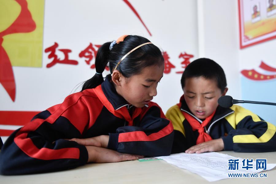 1/03月17日,在果洛藏族自治州甘德縣崗龍鄉(xiāng)寄宿制中心小學(xué),學(xué)生扎加(右)和崗尖卓瑪在紅領(lǐng)巾廣播室播音。(新華社記者 張龍/攝)