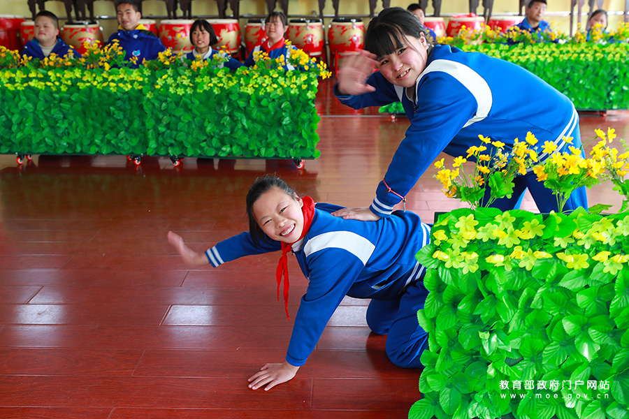 3月23日,貴州省務(wù)川縣特教學(xué)校學(xué)生在排練《牧牛童趣》,準(zhǔn)備參加貴州省特校文藝會演。(鄭啟彥、張學(xué)軍/攝)
