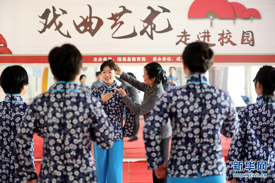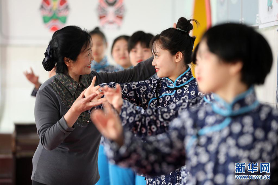 1/04月12日,在邢臺市隆堯縣成龍易衡實驗學(xué)校京劇課堂,戲曲老師指導(dǎo)學(xué)生練習(xí)京劇表演基本功。(新華社記者 駱學(xué)峰/攝)