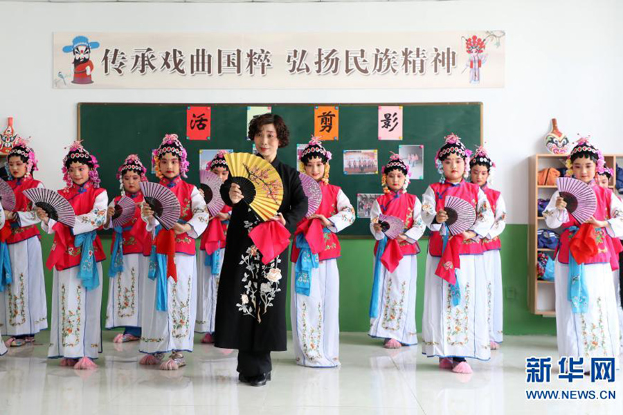 1/04月12日,在邢臺市隆堯縣第三實驗小學(xué)京劇課堂,戲曲老師指導(dǎo)學(xué)生練習(xí)京劇表演基本功。(新華社記者 駱學(xué)峰/攝)