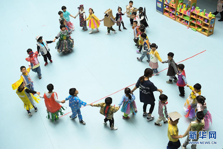 1/04月22日,老師帶著身穿環(huán)保時(shí)裝的孩子們做游戲。(新華社記者 翁忻旸/攝)