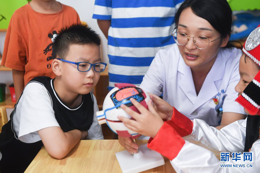 1/08月11日,東林衛(wèi)生院的黨員志愿者醫(yī)生給孩子們講解眼睛的構(gòu)造和視力保護(hù)知識(shí)。(新華社記者 徐昱/攝)