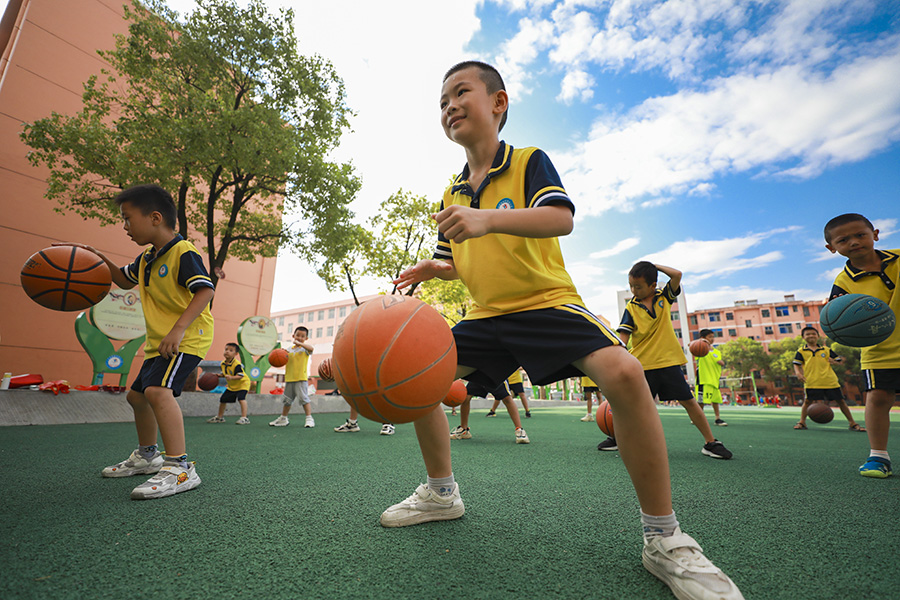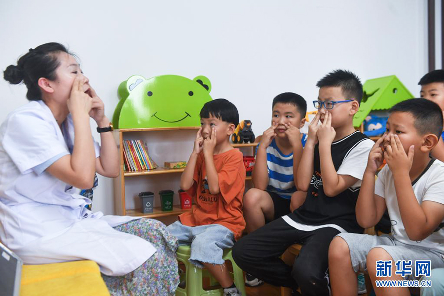 1/08月11日,東林衛(wèi)生院的黨員志愿者醫(yī)生指導(dǎo)孩子們做眼保健操。(新華社記者 徐昱/攝)