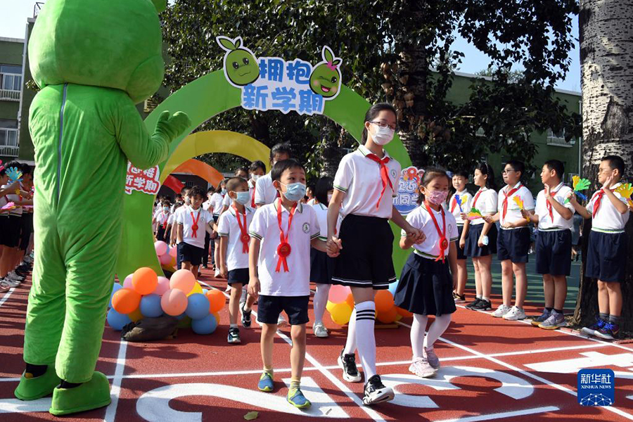 1/09月1日,在北京市海淀區(qū)太平路小學(xué),一年級(jí)新生與老師一起參加開學(xué)典禮。當(dāng)日,全國多地中小學(xué)校迎來開學(xué)日。(新華社記者 任超/攝)