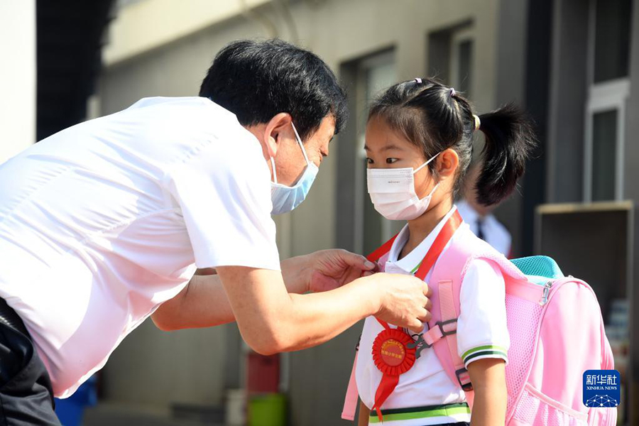 1/09月1日,在北京市海淀區(qū)太平路小學(xué),老師為一年級(jí)新生佩戴“小紅花”。(新華社記者 任超/攝)