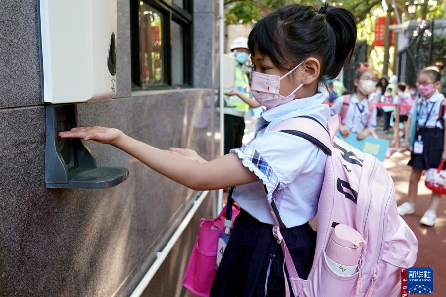 1/09月1日,上海市黃浦區(qū)盧灣二中心小學(xué)的學(xué)生入校后進(jìn)行手部消毒。(新華社記者 劉穎/攝)