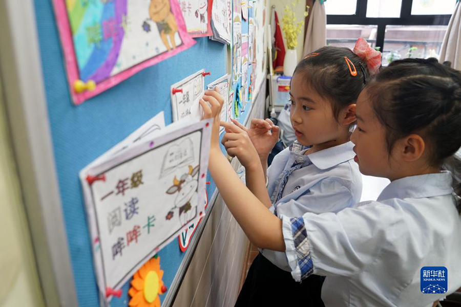 1/09月1日,上海市黃浦區(qū)盧灣二中心小學(xué)的教室內(nèi),學(xué)生們?cè)诜赐瑢W(xué)暑假里的閱讀書目和筆記。(新華社記者 劉穎/攝)