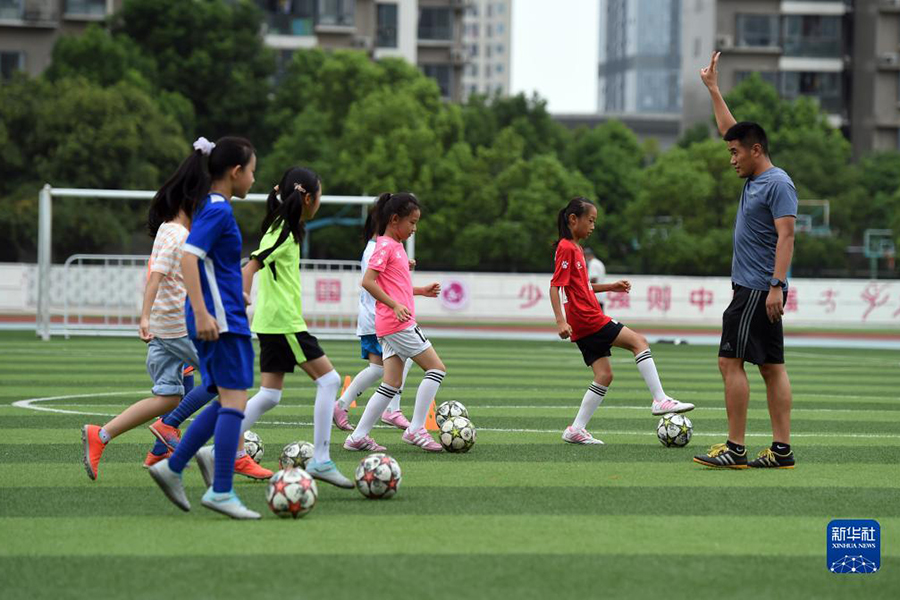 1/09月2日,在合肥市師范附屬第三小學(xué),女子足球社團(tuán)的同學(xué)們在教練帶領(lǐng)下訓(xùn)練。(新華社記者 周牧/攝)