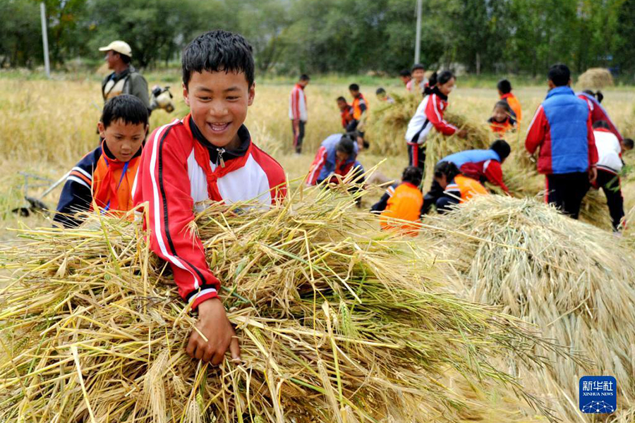 1/0日喀則市上海實(shí)驗(yàn)學(xué)校的學(xué)生們在青稞地里勞動(9月17日攝)。(新華社發(fā) 潘杰/攝)