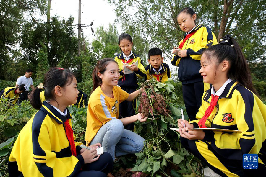 1/09月24日,在棗莊市市中區(qū)中興小學(xué)的勞動(dòng)實(shí)踐基地,老師在向?qū)W生講解地瓜的栽培知識(shí)。(新華社發(fā) 孫中喆/攝)