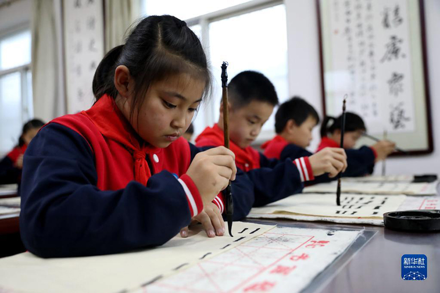 1/010月8日,河北省邢臺(tái)市任澤區(qū)達(dá)二小學(xué)學(xué)生在練習(xí)書法。(新華社記者 駱學(xué)峰/攝)