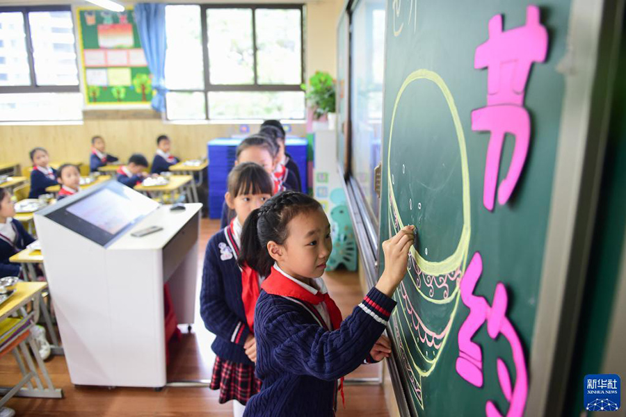 1/010月15日,在合肥市翡翠學(xué)校三年級七班,孩子們在黑板上的“碗”中畫下一粒米。(新華社記者 杜宇/攝)