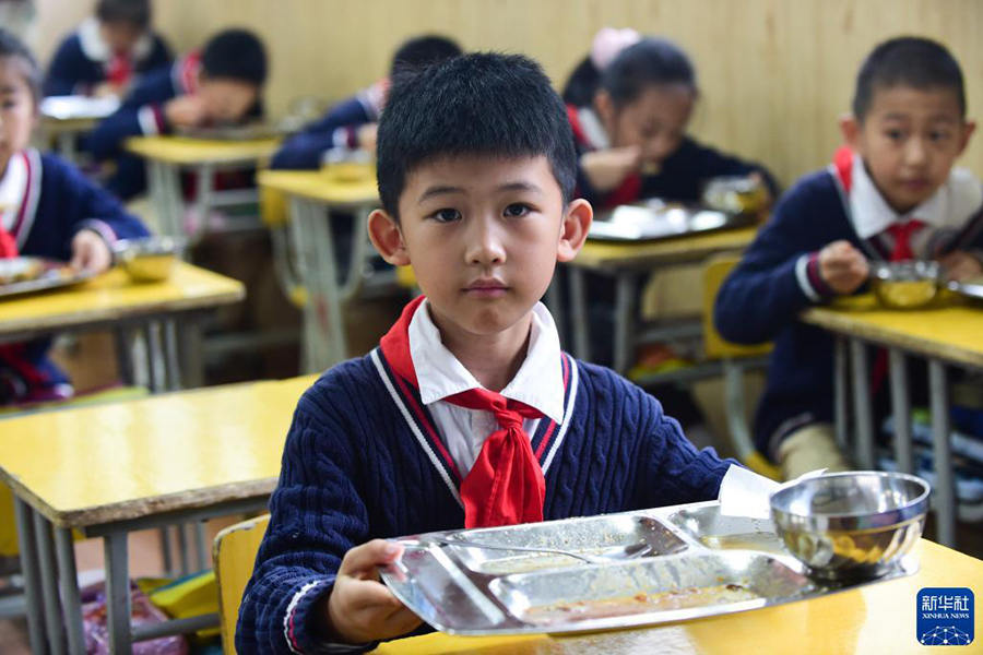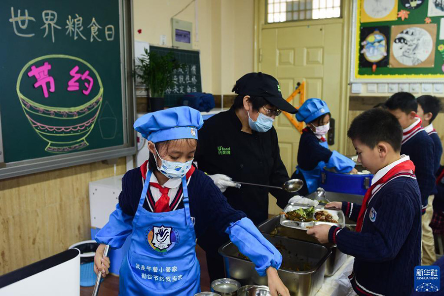 1/010月15日,在合肥市翡翠學(xué)校三年級七班,孩子們在吃午餐。當(dāng)日,安徽合肥市翡翠學(xué)校開展“踐行光盤 從小做起”世界糧食日主題活動。老師通過引導(dǎo)孩子們在學(xué)校的午餐中適量取餐,鼓勵孩子們做到不剩飯和菜,并讓每一位做到“光盤”的孩子在黑板上的“碗”中畫上一粒米,加深孩子們對糧食的認(rèn)知,養(yǎng)成勤儉節(jié)約、珍惜糧食的習(xí)慣。(新華社記者 杜宇/攝)