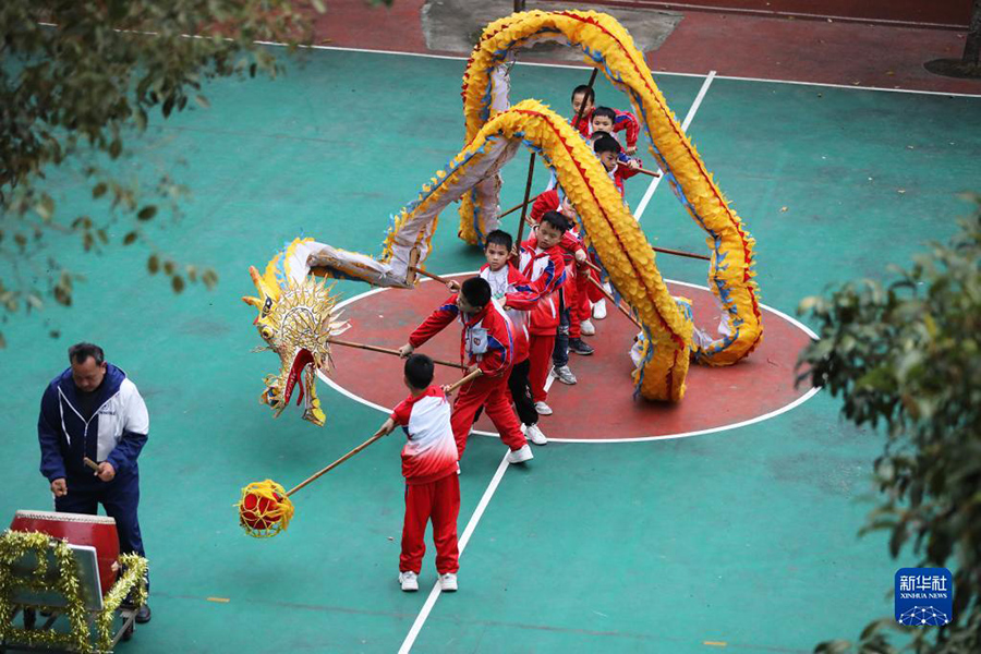 1/011月4日,貴州省錦屏縣城關(guān)第二小學(xué)學(xué)生在舞花臉龍。(新華社發(fā) 楊曉海/攝)