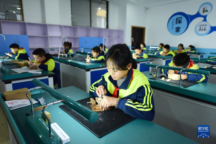 1/011月4日,貴州省黔東南苗族侗族自治州岑鞏縣第三小學(xué)學(xué)生利用課后時(shí)間練習(xí)篆刻。(新華社發(fā) 唐鵬/攝)