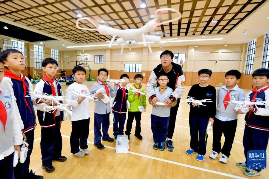 1/011月4日,浙江省臺(tái)州市路橋區(qū)南官小學(xué)學(xué)生在課后托管班學(xué)習(xí)無(wú)人機(jī)原理和飛行技術(shù)。(新華社發(fā) 王保初/攝)