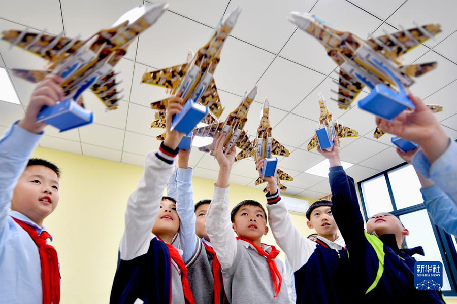 1/011月4日,浙江省臺(tái)州市路橋區(qū)南官小學(xué)學(xué)生在課后托管班展示自己制作的飛機(jī)。(新華社發(fā) 王保初/攝)