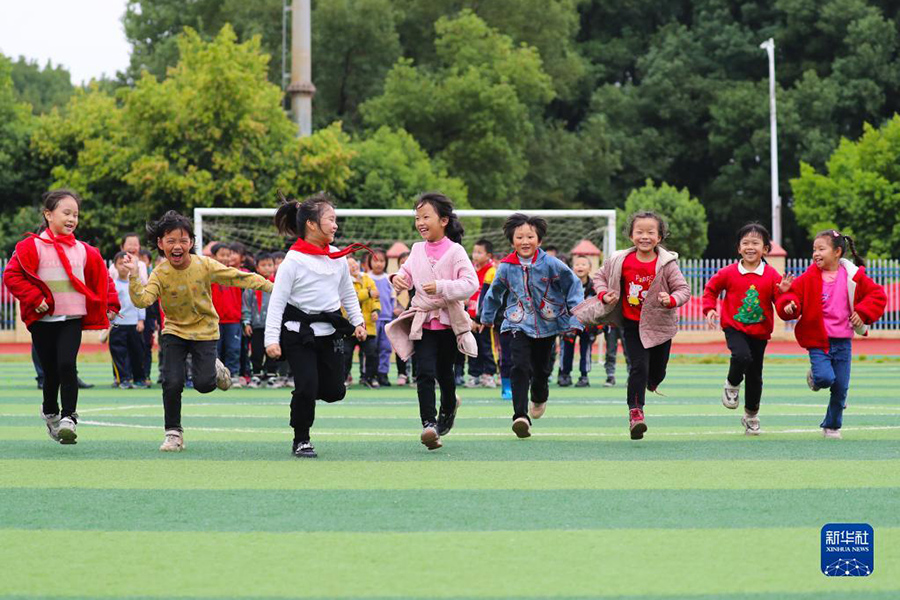 1/011月4日,在湖南省永州市新田縣雙碧小學(xué),孩子們?cè)谶\(yùn)動(dòng)場(chǎng)上做游戲。(新華社發(fā) 劉貴雄/攝)