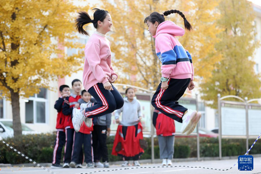 1/011月3日,山東省臨沂市沂南縣磚埠鎮(zhèn)中心小學(xué)學(xué)生在“第二課堂”上跳繩。(新華社發(fā) 杜昱葆/攝)