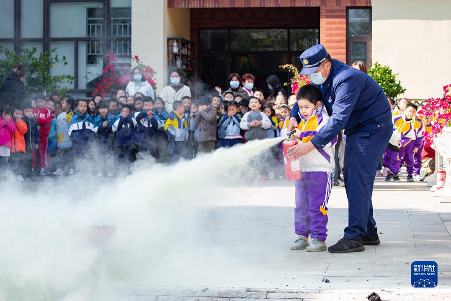 1/011月8日,在南京市雨花臺(tái)區(qū)宏圖上水幼兒園,小朋友在消防員的輔助下體驗(yàn)使用滅火器。(新華社發(fā) 蘇陽(yáng)/攝)