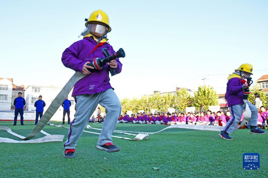 1/011月8日,山東省棗莊市市中區(qū)東湖小學(xué)的學(xué)生在操場(chǎng)上做消防趣味游戲。(新華社發(fā) 孫中喆/攝)